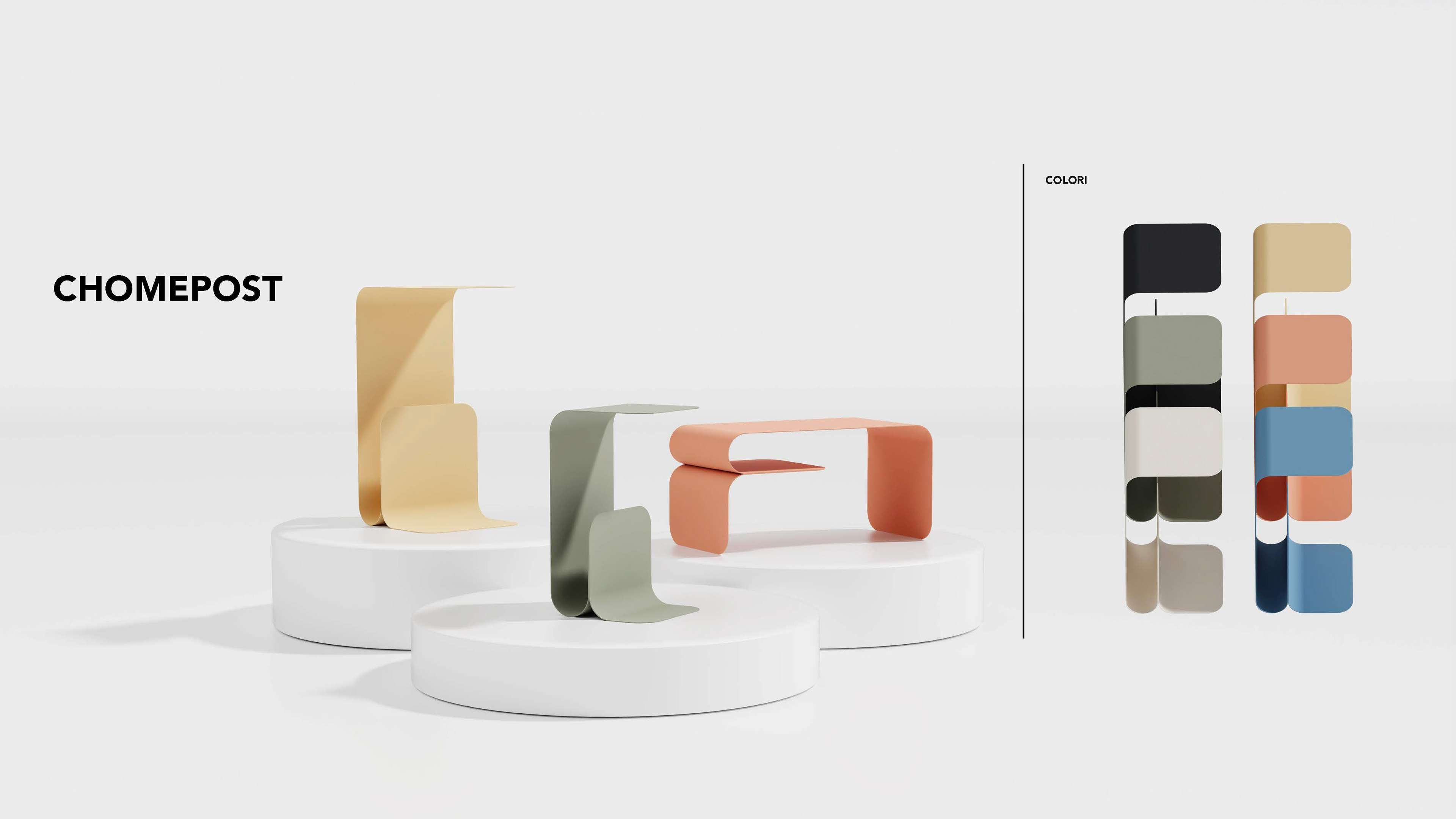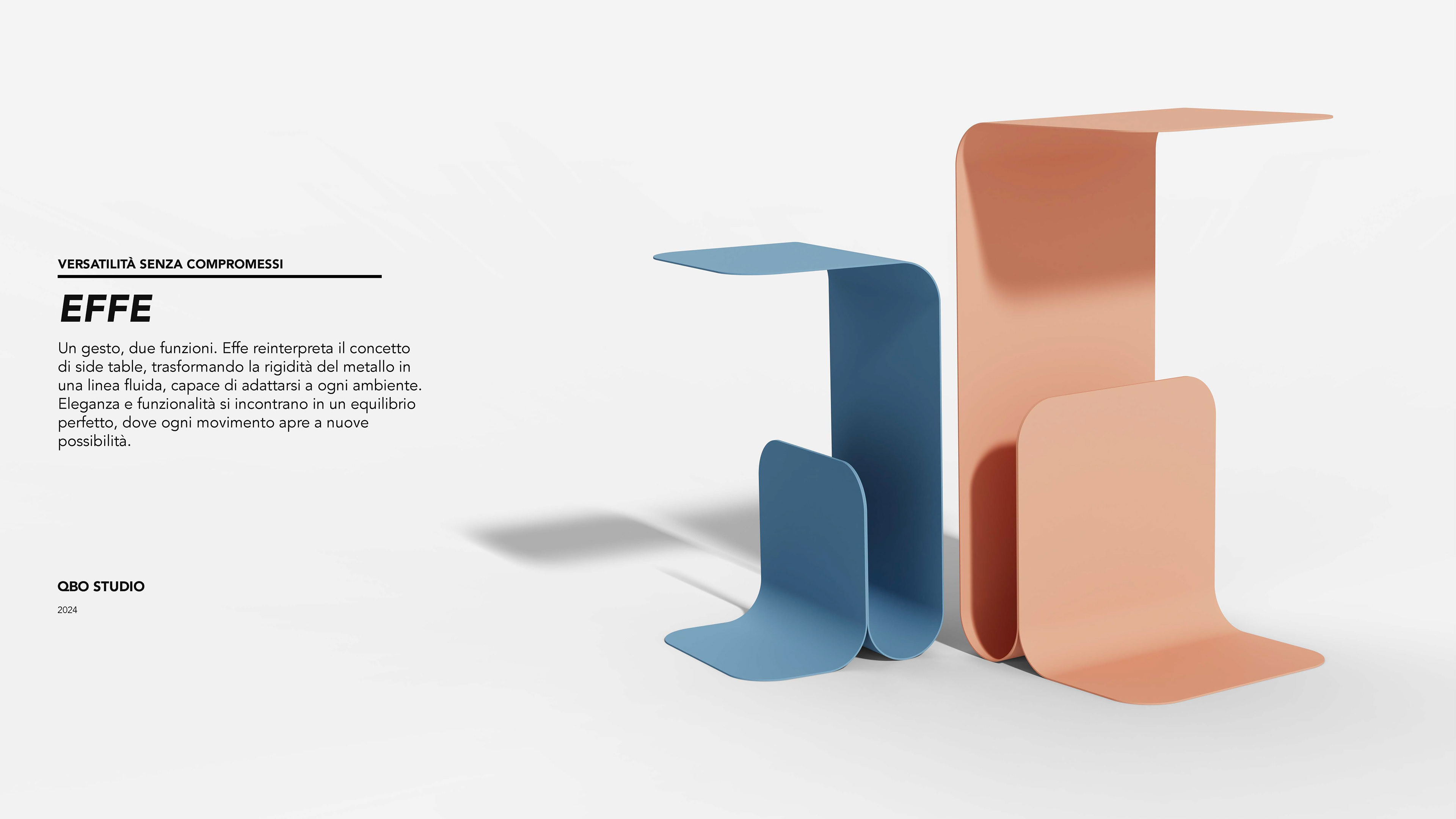 Effe è un side table dinamico, dove un unico gesto trasforma la funzione. Il metallo si piega in una linea fluida, unendo estetica e versatilità in un design intuitivo e adattabile a ogni ambiente.